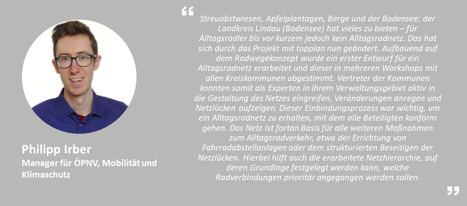 Im Zuge des Projektes hatten alle Beteiligten die Möglichkeit Ideen und Anregungen einzubringen und Vorschläge zu machen, worauf sich der Landkreis Lindau bei Projekten in Zukunft fokussieren sollte. topplan hat im Rahmen des Projektes die Bestandsanalysen und Vorgespräche durchgeführt, den Workshop moderiert und im Nachgang die Ergebnisse ausgewertet. So konnten fachlich sinnvolle Handlungsempfehlungen für den Landkreis Lindau erarbeitet werden, auf die sich die Radverkehrsverantwortlichen auch in Zukunft stützen können.